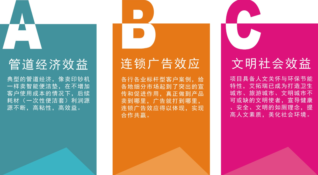 艾拓瑞(iTOILET)智能便潔墊的問世,大大改善了廁所衛(wèi)生現(xiàn)狀,艾拓瑞(iTOILET)智能便潔墊強調的是徹底解決坐墊衛(wèi)生問題,用前輕輕一按,自動切換一次性坐墊,簡單快捷,環(huán)保節(jié)能。更適用于酒店賓館、醫(yī)院會所、美容美體、機場碼頭、寫字樓等公共場所及家庭客廳衛(wèi)生間的馬桶配套使用。馬桶安全套,衛(wèi)生又環(huán)保。一人一廁,方便再無后"股"之憂!典型的朝陽產業(yè),未來趨勢;市場巨大,前景無限!
