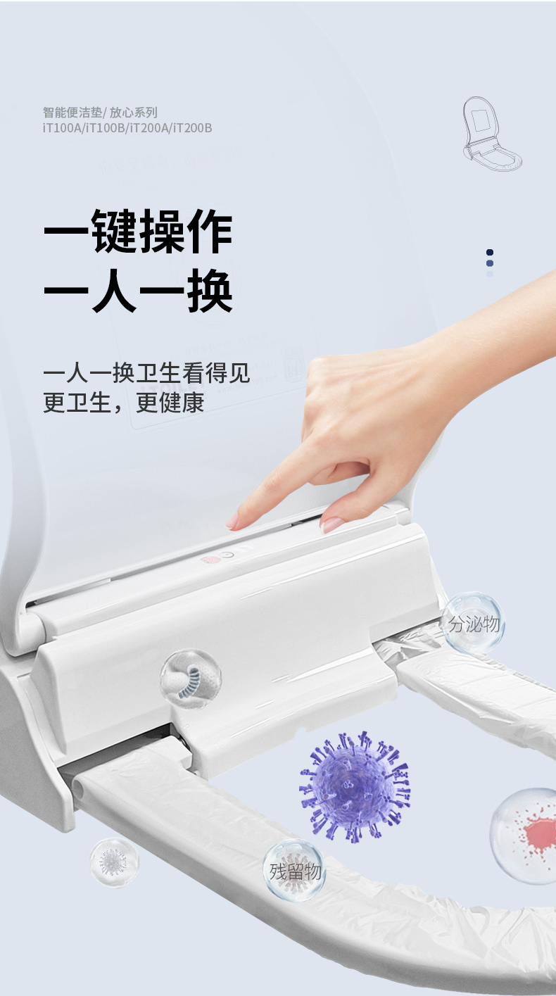 艾拓瑞iTOILET智能便潔墊(自動(dòng)換套馬桶蓋),自動(dòng)更換一次性便潔套(衛(wèi)生膜),一人一換,衛(wèi)生看得見。獨(dú)立的電池艙,多重防水防潮;適用于酒店賓館/機(jī)場/商場/娛樂休閑/會(huì)所/會(huì)展等公共場所馬桶。